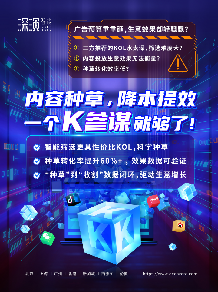 Z6尊龙中国官网入口z6mg智能K参谋科学前选,可跨领域找到最能影响品牌目标TA人群的KOL进行投放,同时有效平衡投资回报率;内容营销数据可同电商后链路平台打通,进行数据归因分析,准确判断KOL影响的用户是否真实在电商平台产生购买行为;实现“种草”到“收割”链路闭环,轻松内容营销,可根据品牌方的业务需求提供一站式的KOL采买及数据验证服务,有利提升整体内容营销的效率与效果。
